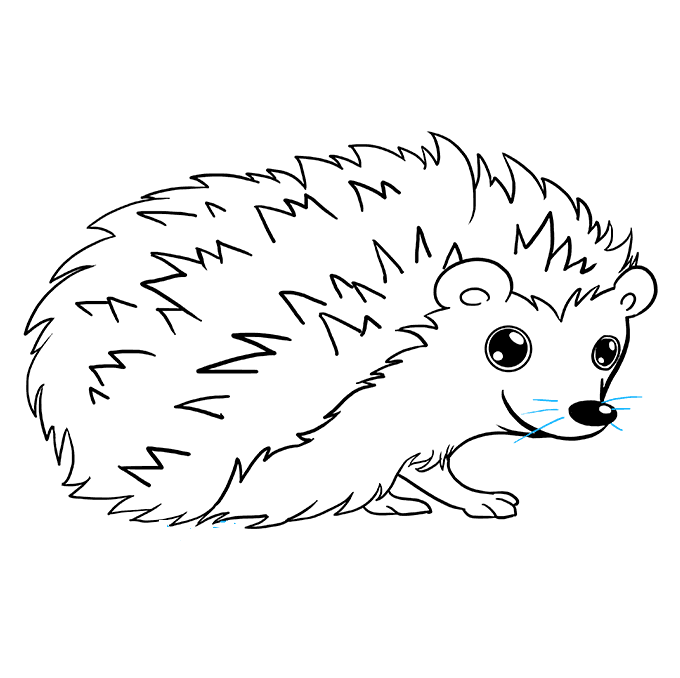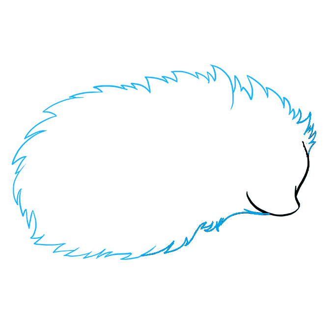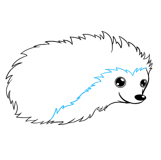 Aggiungi punte sul retro. Le spine sono disegnate con curve strette che si estendono attorno al corpo del riccio da un lato all’altro.