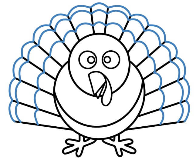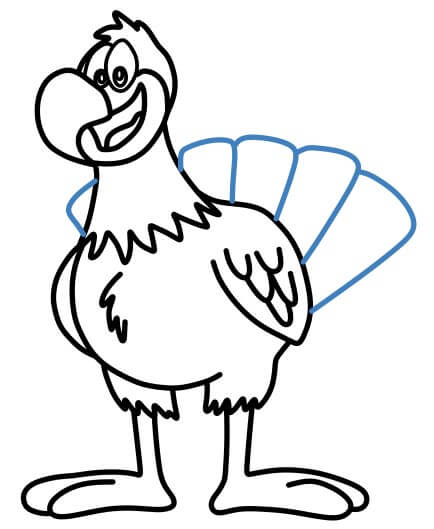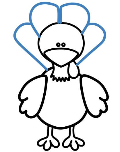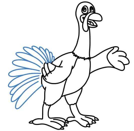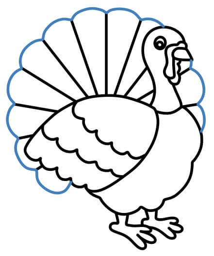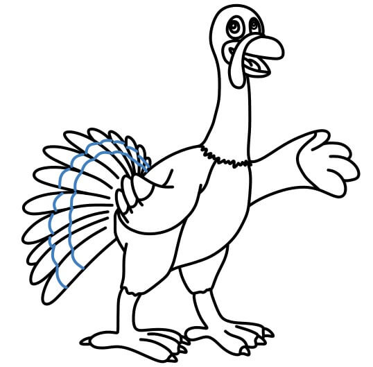 A partire dalle linee, disegna le piume curve della coda del tacchino.